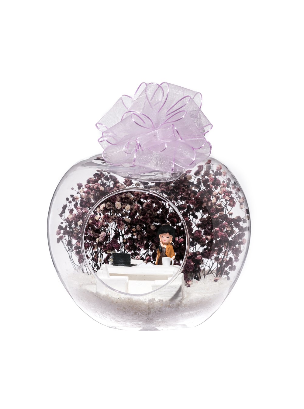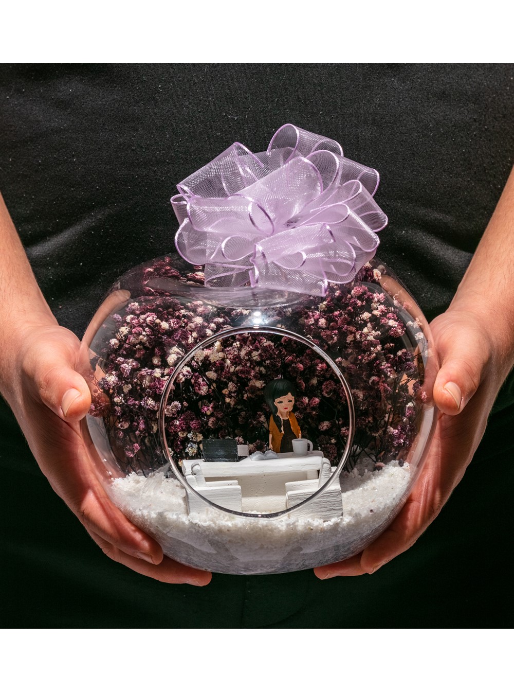 Küçük boy elma cam fanus içerisinde tasarladığımız bu kurdeleli teraryum, yeni işine başlayanları, gördükleri anda mutlu edecek şekilde tasarlandı. Tasarımımız; beyaz kum, kurutulmuş bitkilerle beraber bir adet mini ofis görseli ve bir adet bayan objeyle tamamlanmıştır. Ev ve ofis ortamlarının tamamında sergilenebilir teraryumun içinde, kurutulmuş bitkiler bulunduğundan hava alması önemlidir. Açık olan kısmının kapatılmaması veya büfe vb. kapalı alanlara konulmaması gereklidir.. Özellikle her ortamda, zevkle izlenebilecek çok özel bir teraryumdur. Yaklaşık Ölçüleri: 20x20cm NOT: Teraryumlarda kullanılan camlar, üfleme cam işçiliğiyle üretildiğinden bazı detaylarda farklılıklar gözlenebilir. Örneğin, sap kısmı ve ağız bitiş noktalarının her biri kendine özgüdür.