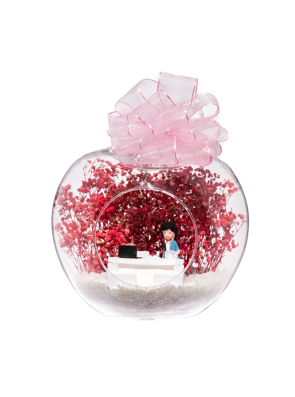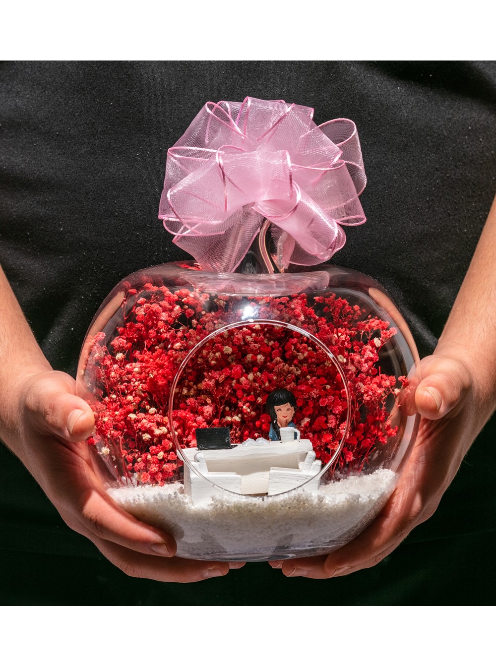 Küçük boy elma cam fanus içerisinde tasarladığımız bu kurdeleli teraryum, yeni işine başlayanları, gördükleri anda mutlu edecek şekilde tasarlandı. Tasarımımız; beyaz kum, kurutulmuş bitkilerle beraber bir adet mini ofis görseli ve bir adet bayan objeyle tamamlanmıştır. Ev ve ofis ortamlarının tamamında sergilenebilir teraryumun içinde, kurutulmuş bitkiler bulunduğundan hava alması önemlidir. Açık olan kısmının kapatılmaması veya büfe vb. kapalı alanlara konulmaması gereklidir.. Özellikle her ortamda, zevkle izlenebilecek çok özel bir teraryumdur. Yaklaşık Ölçüleri: 20x20cm NOT: Teraryumlarda kullanılan camlar, üfleme cam işçiliğiyle üretildiğinden bazı detaylarda farklılıklar gözlenebilir. Örneğin, sap kısmı ve ağız bitiş noktalarının her biri kendine özgüdür.