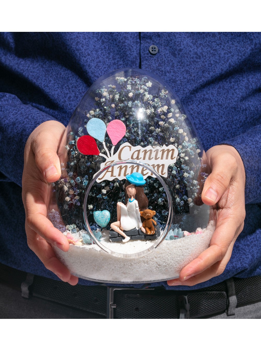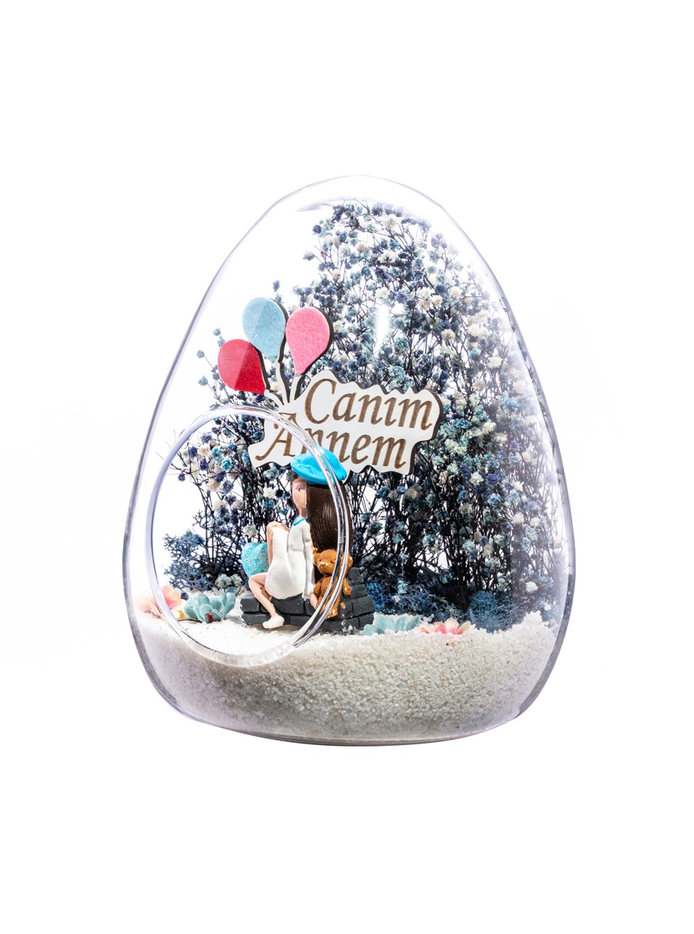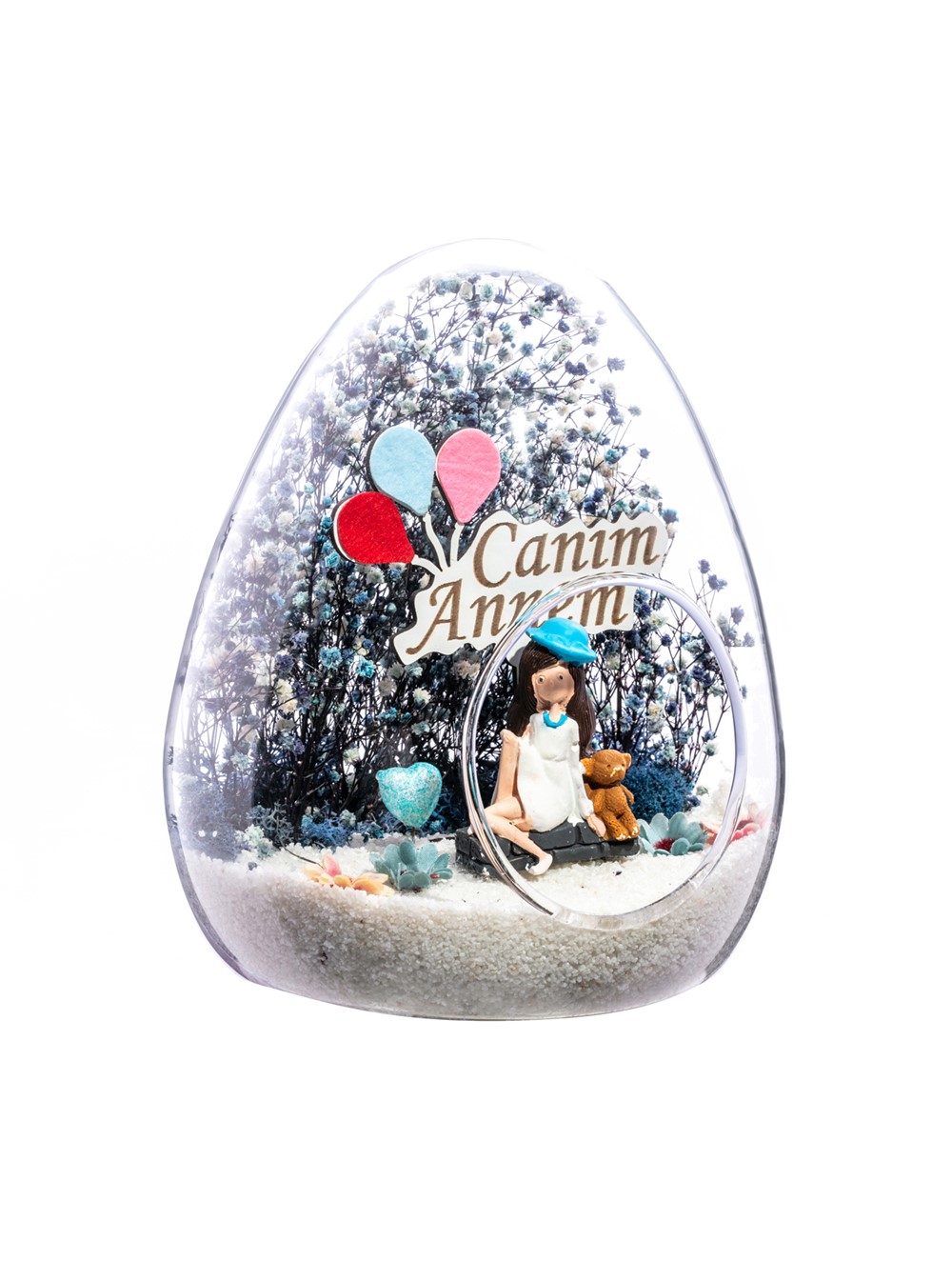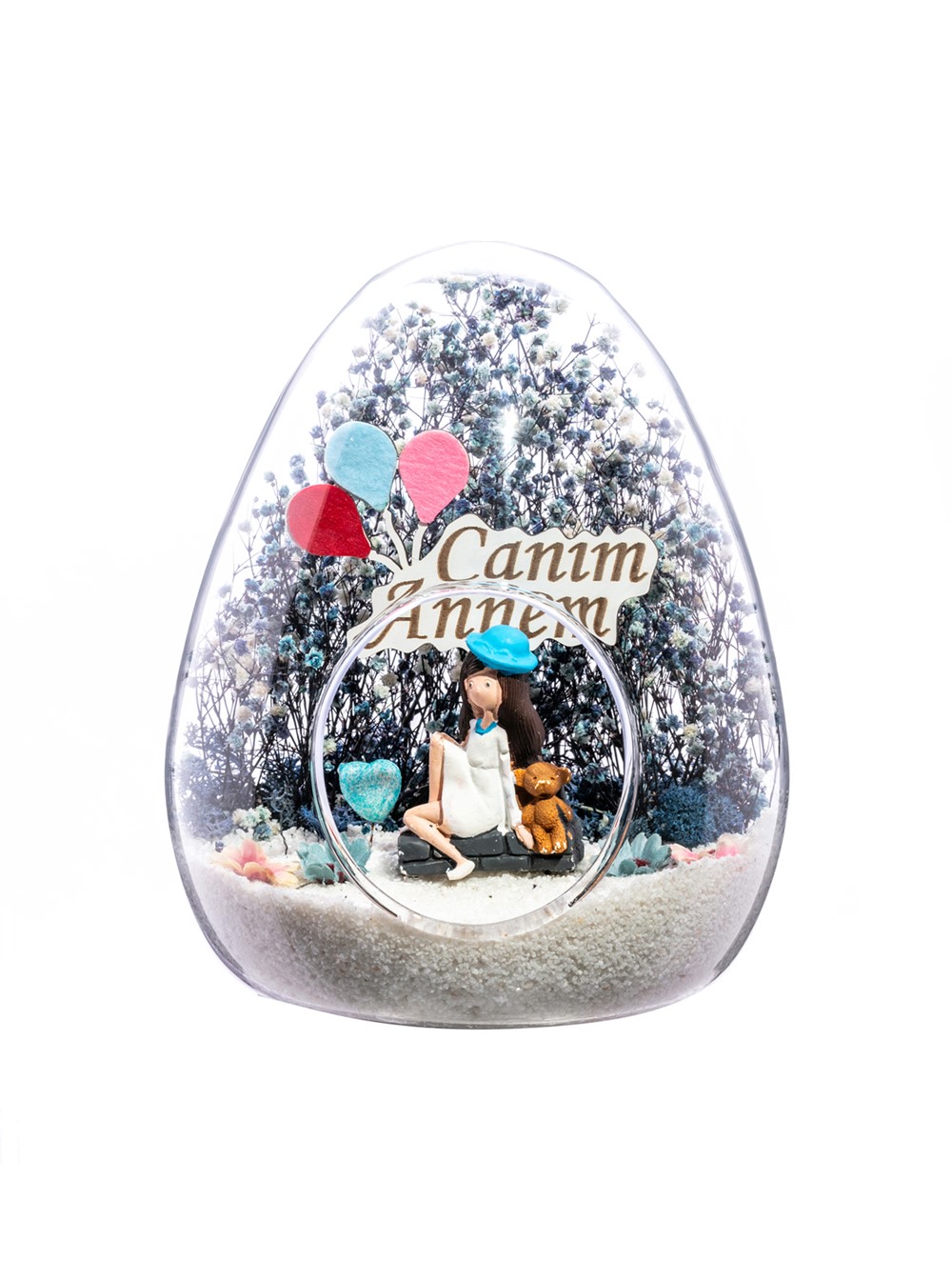 Küçük boy yumurta cam fanus içerisinde tasarladığımız teraryum; beyaz kum, kurutulmuş bitkiler, şoklanmış yosunlar, yapay çiçekler, bir adet simli kalp, bir adet ahşap canım annem yazılı balonlu tabela ve bir adet mavi şapkalı genç kadını simgeleyen objelerle tamamlanmıştır. Ev ve ofis ortamlarının tamamında sergilenebilir teraryumun içinde canlı bitki bulunmadığından, herhangi bir bakıma ihtiyacı yoktur. Özellikle her ortamda yıllarca, zevkle izlenebilecek özel bir teraryumdur. Yaklaşık Ölçüleri: 18x22cm NOT: Teraryumlarda kullanılan camlar, üfleme cam işçiliğiyle üretildiğinden bazı detaylarda farklılıklar gözlenebilir. Örneğin, sap kısmı ve ağız bitiş noktalarının her biri kendine özgüdür.