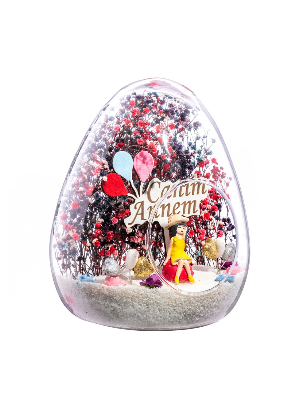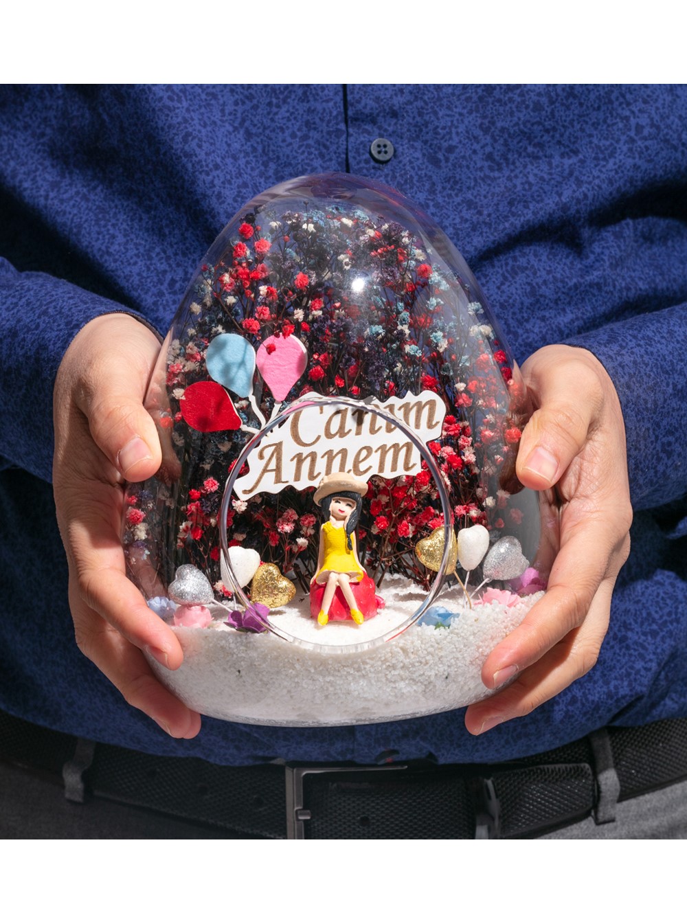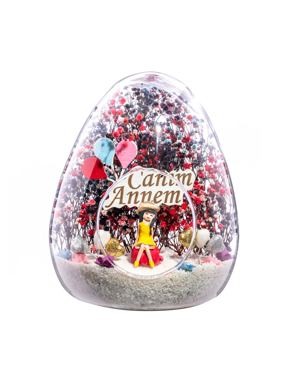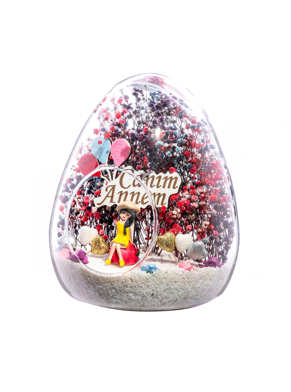 Küçük boy yumurta cam fanus içerisinde tasarladığımız, bu özgün teraryum; beyaz kum, karışık renkli kurutulmuş bitkiler, renkli simli kalpler, renkli mini yapay güller, bir adet ahşap canım annem yazılı balonlu tabela ve bir adet sarı elbiseli genç kadını simgeleyen objeler kullanılarak tamamlanmıştır. Ev ve ofis ortamlarının tamamında sergilenebilir teraryumun içinde, kurutulmuş ve şoklanmış bitkiler olduğundan hava alması önemlidir. Açık olan kısmının kapatılmaması veya büfe vb. kapalı alanlara konulmaması gereklidir. Özellikle her ortamda yıllarca, zevkle izlenebilecek özel bir teraryumdur. Yaklaşık Ölçüleri: 18x22cm NOT: Teraryumlarda kullanılan camlar, üfleme cam işçiliğiyle üretildiğinden bazı detaylarda farklılıklar gözlenebilir. Örneğin, ağız bitiş noktalarının her biri kendine özgüdür.
