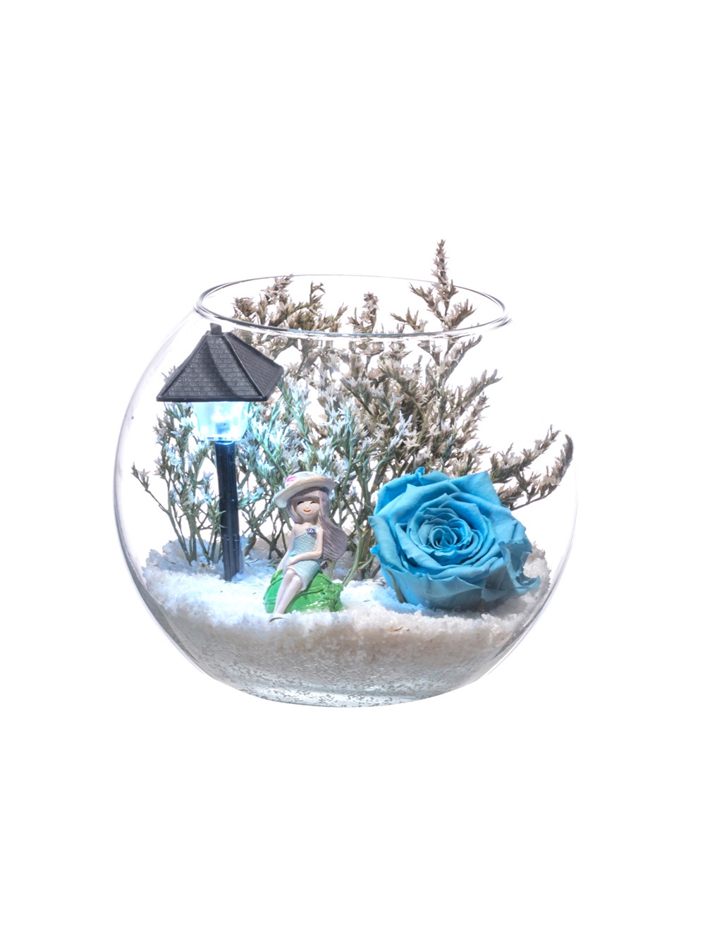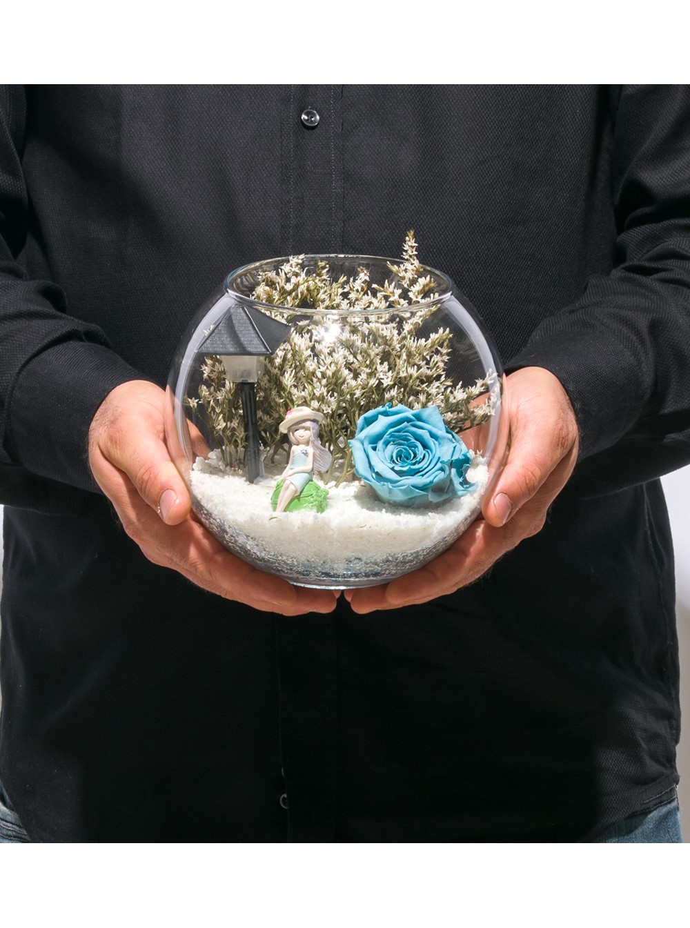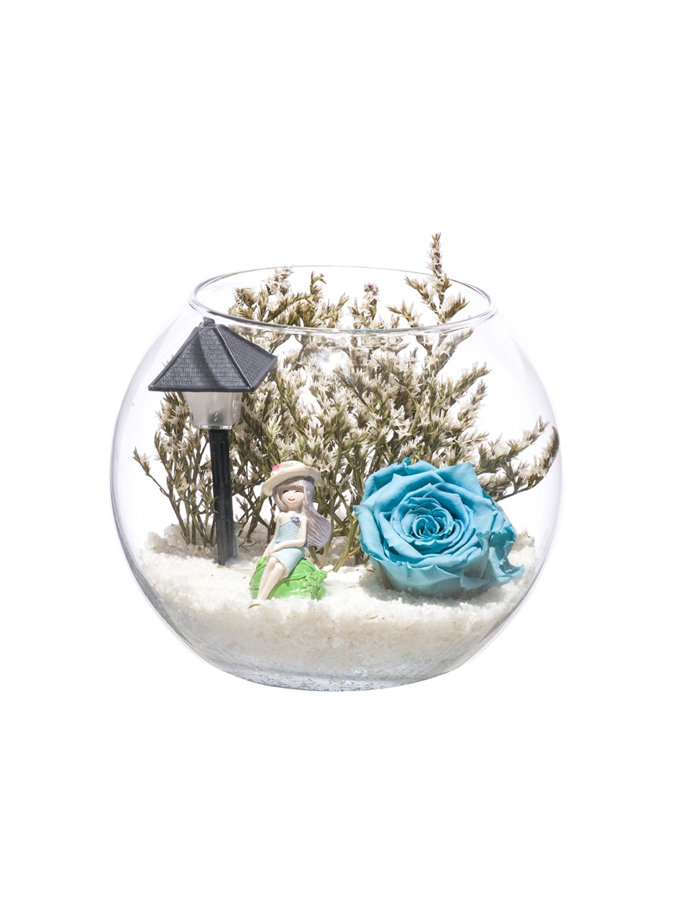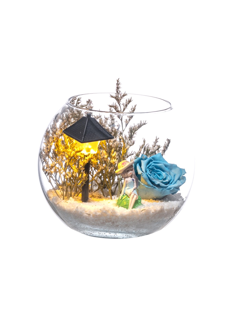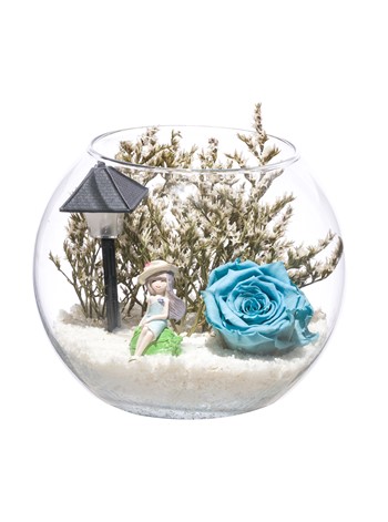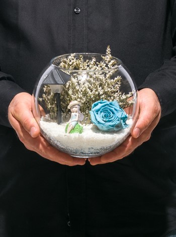 Küçük boy, Paşabahçe cam fanus içerisinde tasarladığımız bu alıcısına özel teraryum; beyaz kum, kurutulmuş bitkiler, bir adet ışığı iki farklı renkte yanan led sokak lambası görseli, bir adet genç kız görseli ve bir adet şoklanmış gerçek gül kullanılarak sizler için tasarlanmıştır. Ev ve ofis ortamlarının tamamında sergilenebilir teraryumun içinde kurutulmuş bitkiler bulunduğundan hava alması önemlidir. Açık olan kısmının kapatılmaması veya büfe vb. kapalı alanlara konulmaması gereklidir. Özellikle her ortamda yıllarca, zevkle izlenebilecek özel bir teraryumdur. Yaklaşık Ölçüleri: 16x18 cm