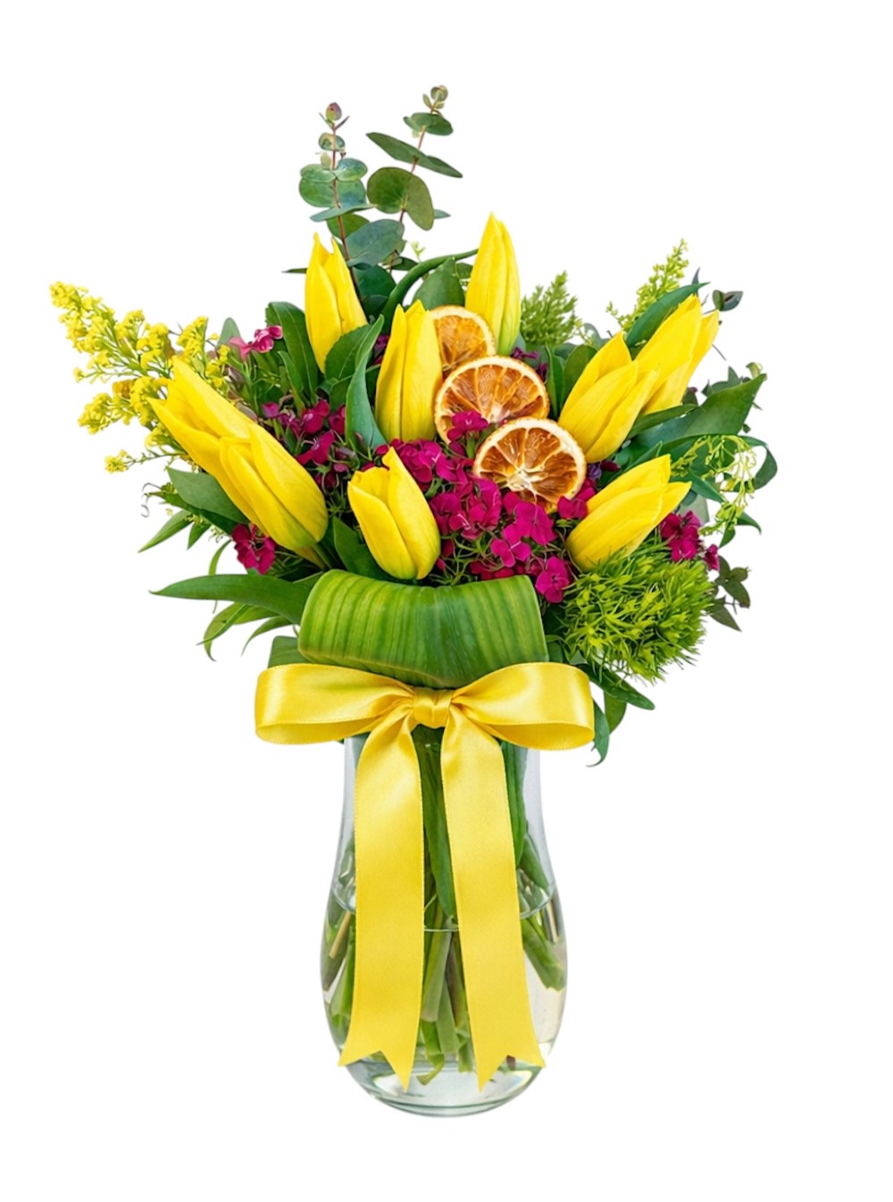 Silindir cam vazoda 9 adet sarı lale, hüsnüyusuf ve yeşillik bulunmaktadır.