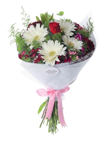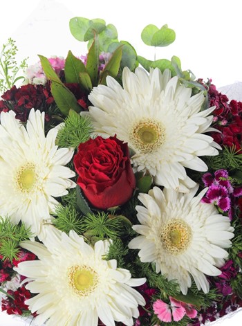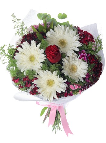 Üründe beyaz gerbera, kırmızı gül ve hüsnüyusuf bulunmaktadır.