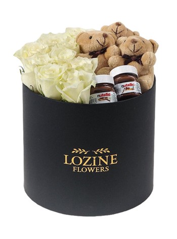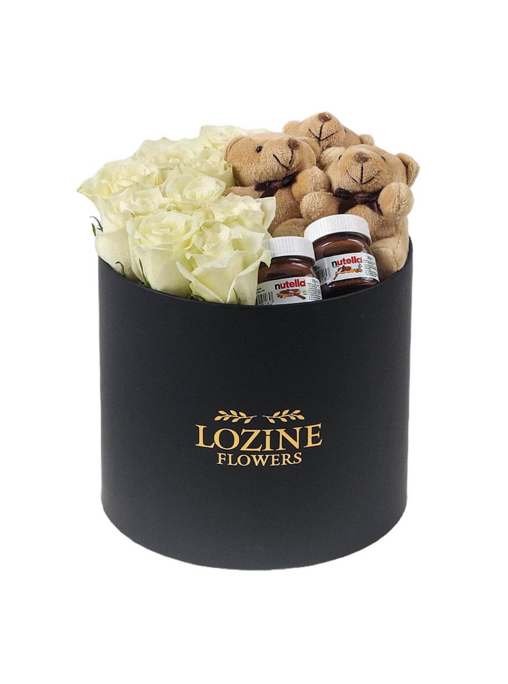Kutuda 9 adet beyaz gül 3 adet ayıcık ve 2 adet mini nutella bulunmaktadır.