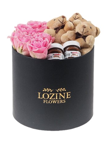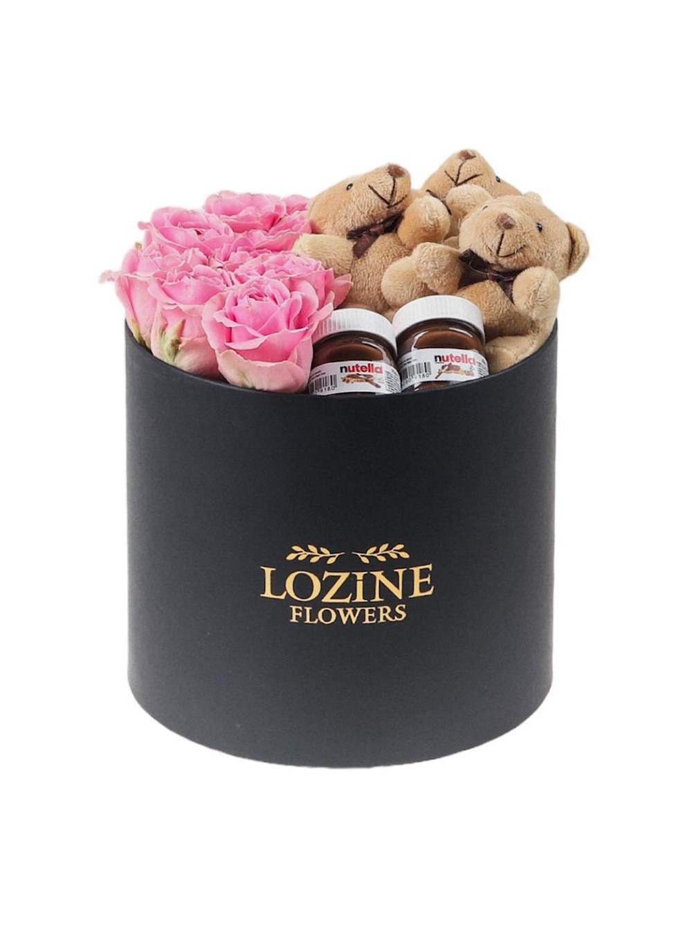 Kutuda 9 adet pembe gül 3 adet ayıcık ve 2 adet mini nutella bulunmaktadır.