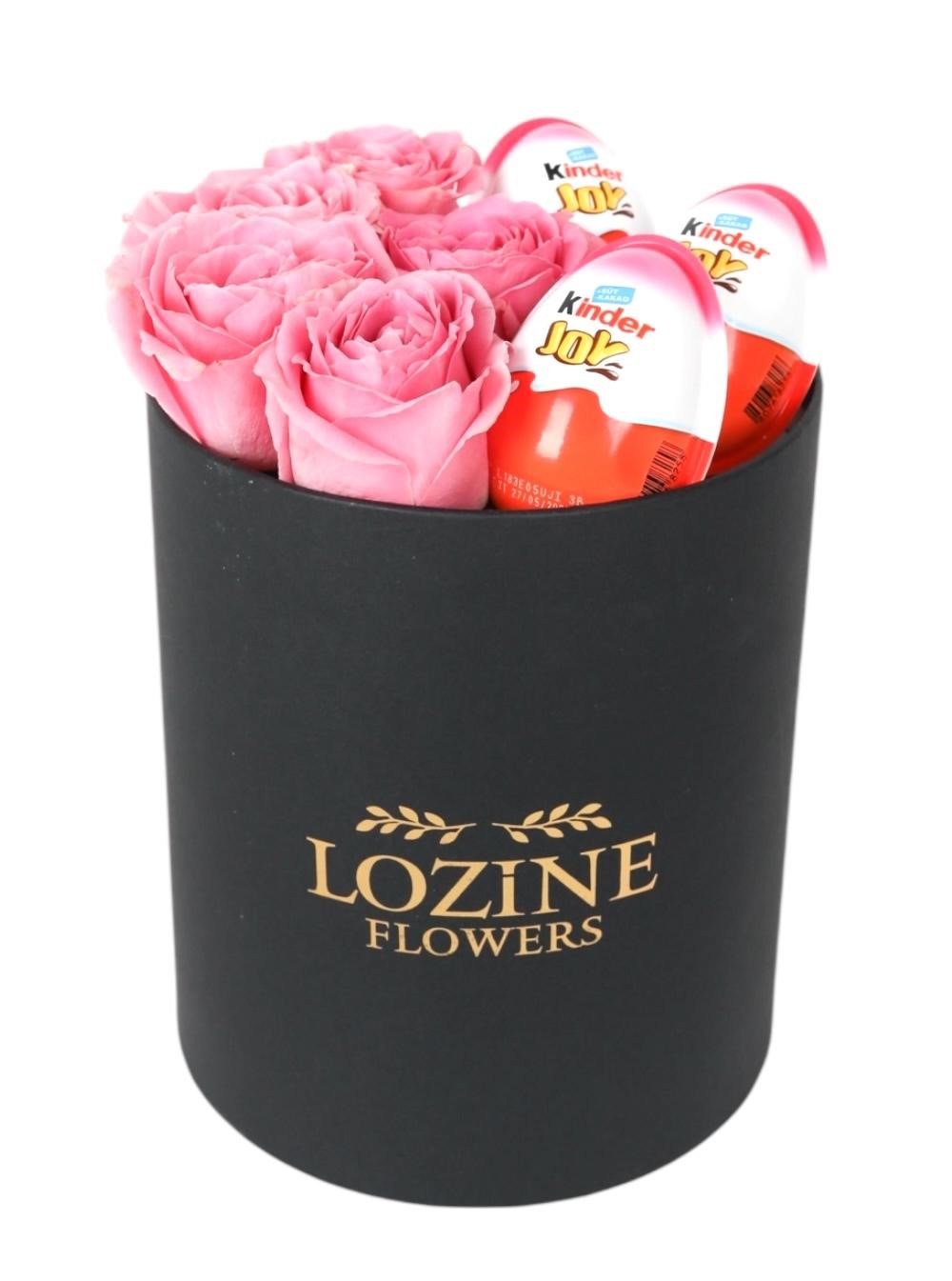Kutuda 5 adet Pembe gül 3 adet kinder joy bulunmaktadır.