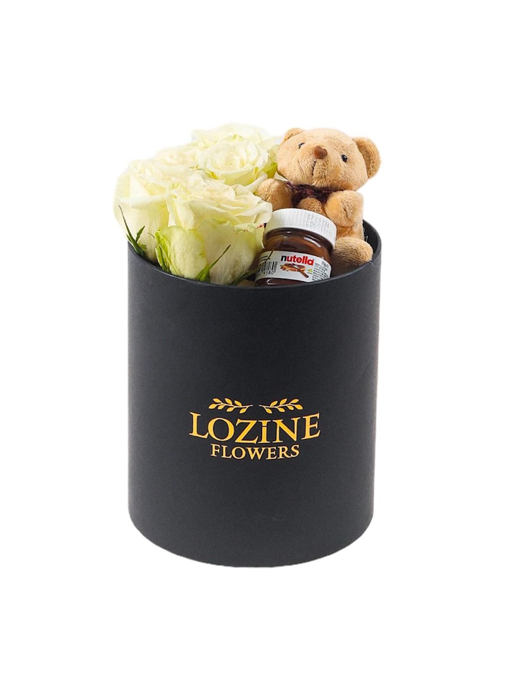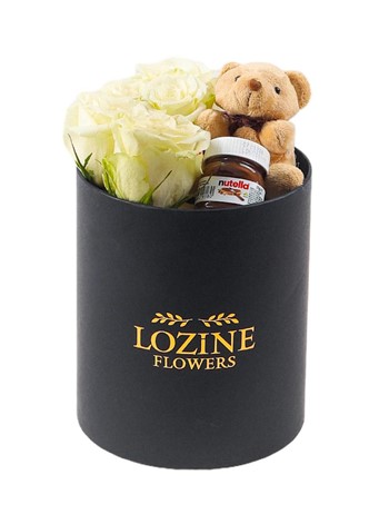 Kutuda 5 adet beyaz gül 1 adet ayıcık ve 1 adet mini nutella bulunmaktadır.