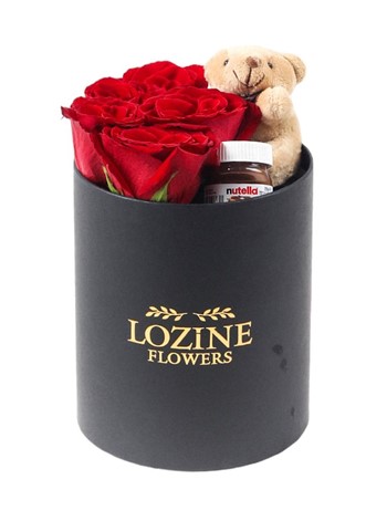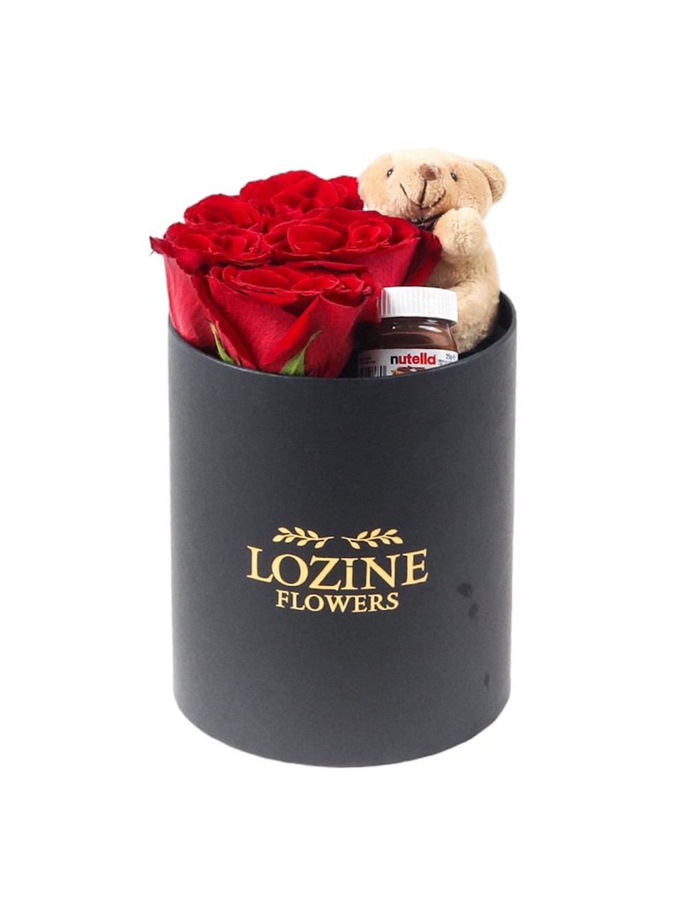 Kutuda 5 adet kırmızı gül 1 adet ayıcık ve 1 adet mini nutella bulunmaktadır.