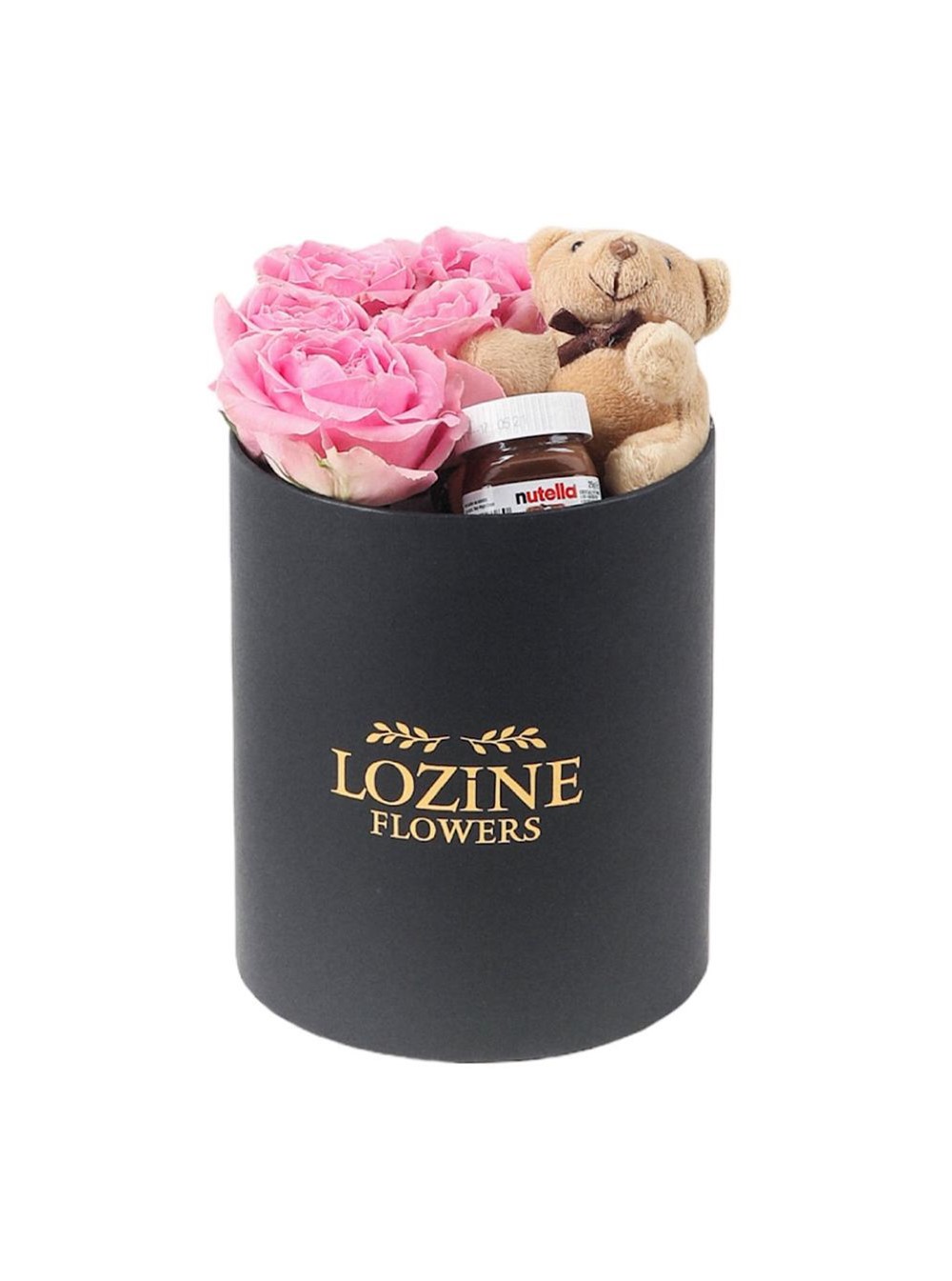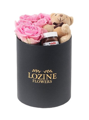 Kutuda 5 adet pembe gül 1 adet ayıcık ve 1 adet mini nutella bulunmaktadır.