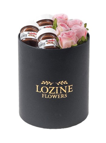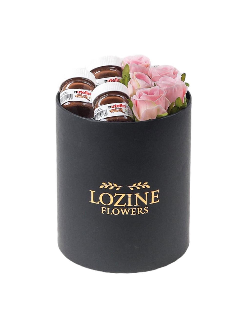 Kutuda 5 adet yapay pembe gül ve 3 adet mini nutella bulunmaktadır.
